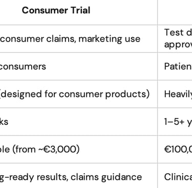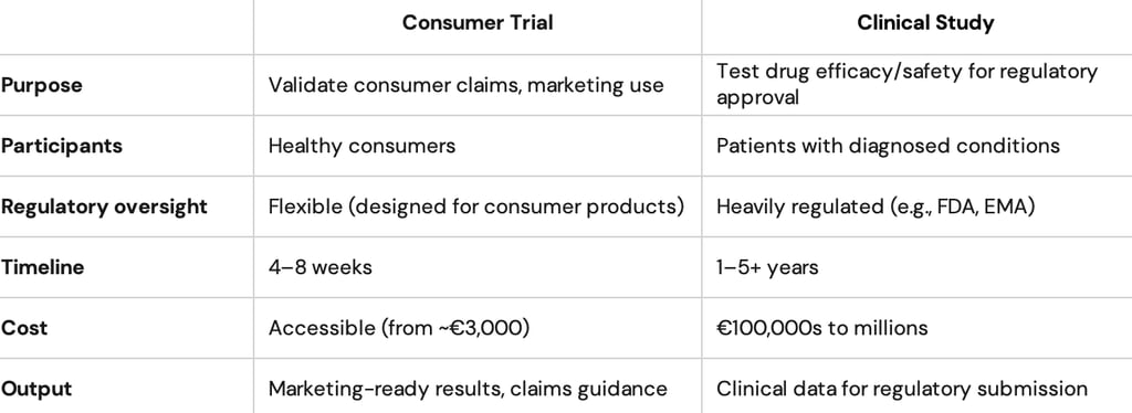 Unlike a clinical trial, which is regulated, drug-focused, and built to satisfy pharmaceutical approval bodies, a consumer trial is designed to answer the questions that actually matter for a consumer health brand: